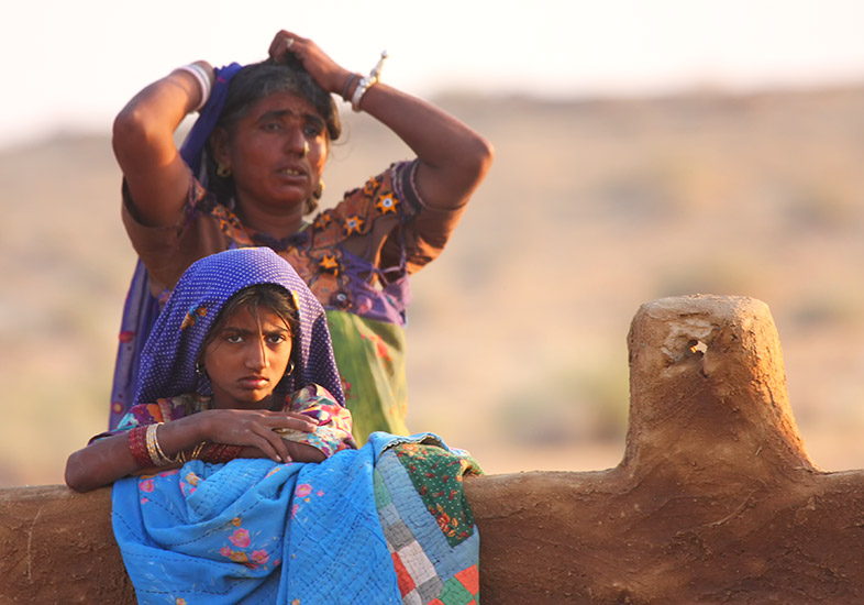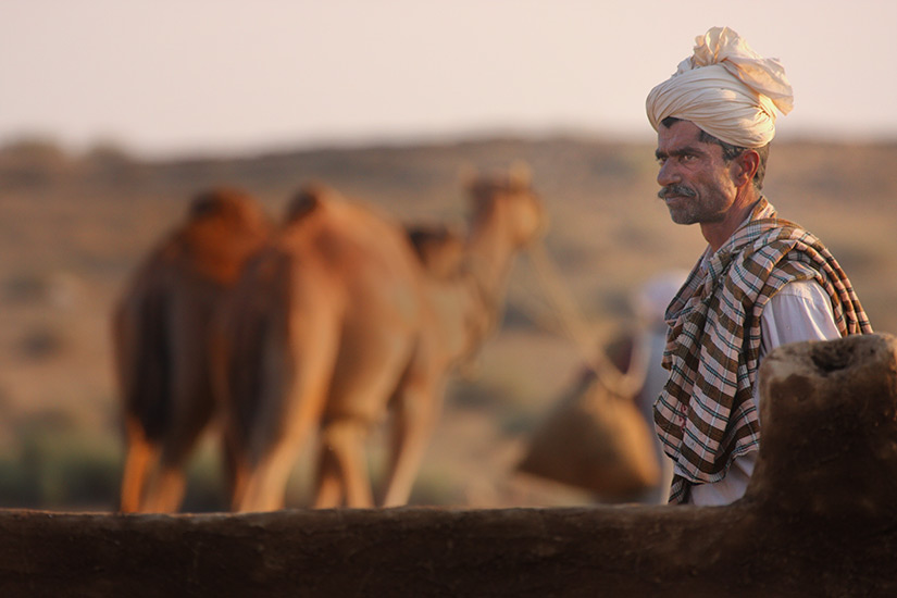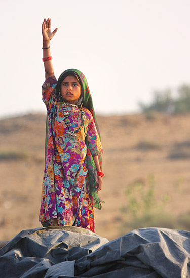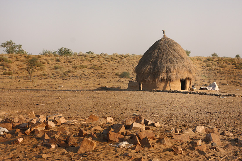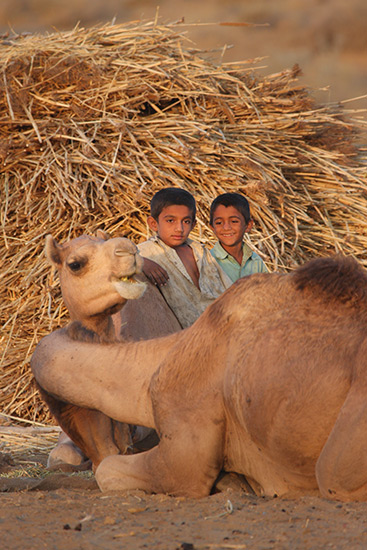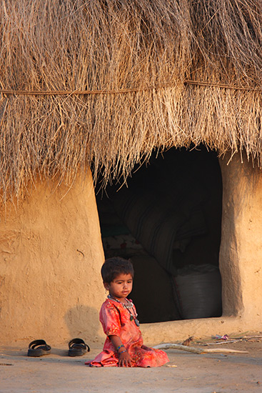 On the border of India and Pakistan, west of Jaisalmer, the nomads still live in villages formed of mud huts with walls defining areas for livestock. Sleeping under the huge night skies one wakes to the children playing with the camels, drinking tea and eating breakfast. The father of this family left to travel to other parts of Pakistan that morning, leaving the mother and three children behind. One would think that the nomadic life would make such separation common place and the families would become desensitised, but the emotion as the father left the village with his camel suggested otherwise. Jaisalmer is now surrounded by many wind turbines and the road network in Rajasthan on the eastern side of this border is being upgraded for both tourist and military use; the nomad way of life has lost its niche due to drastic changes in transport, industry and distribution systems.