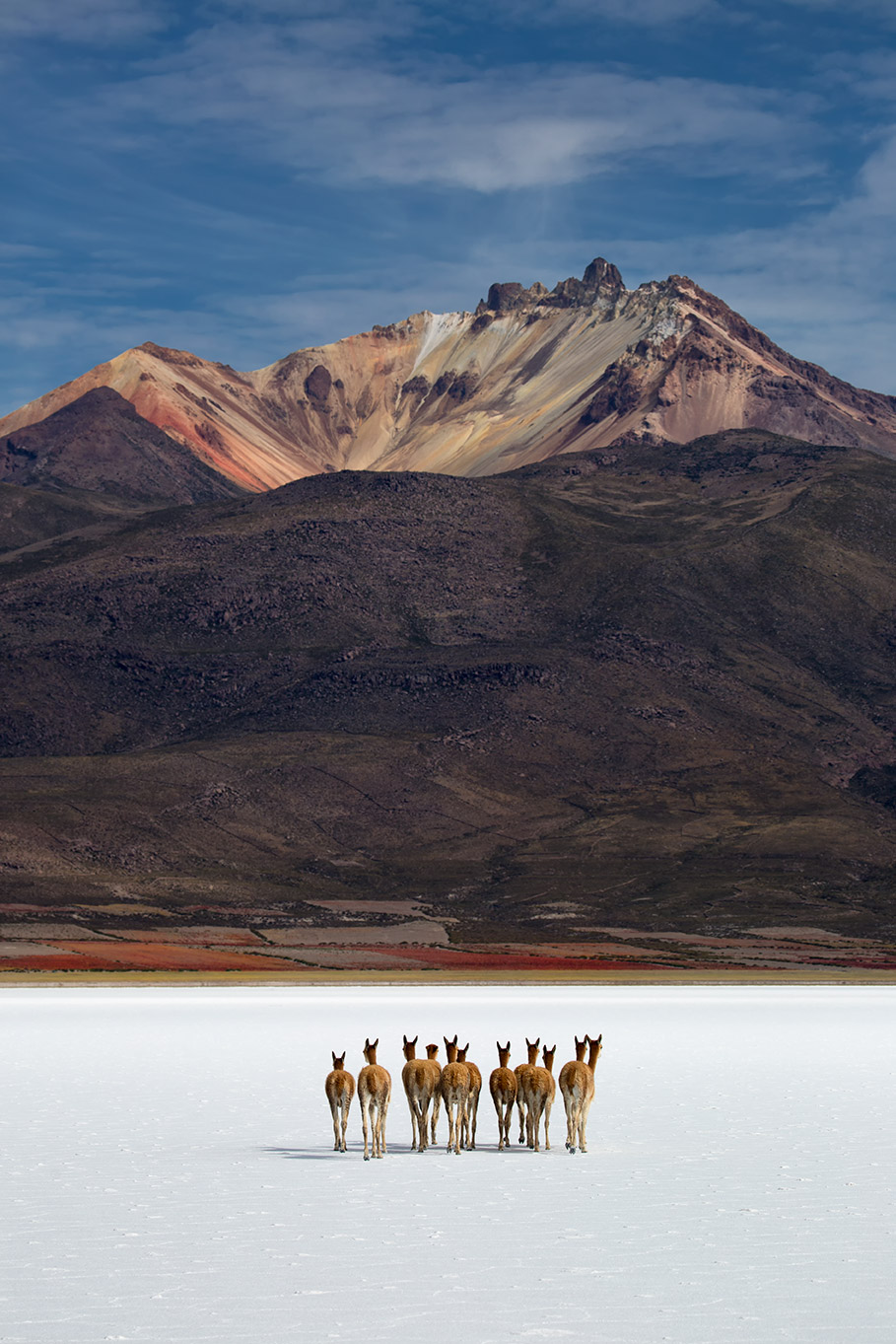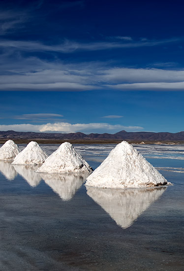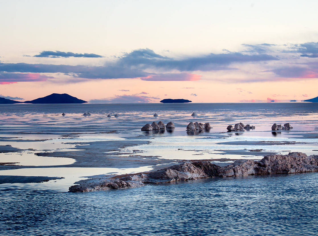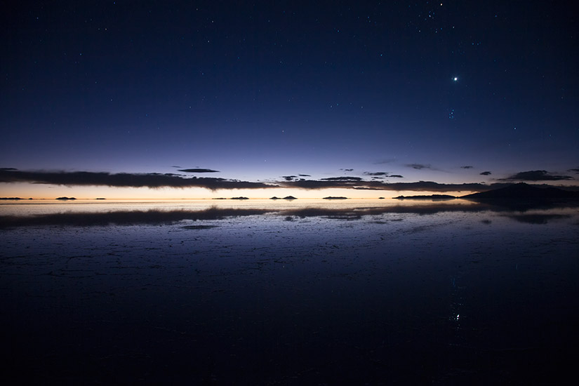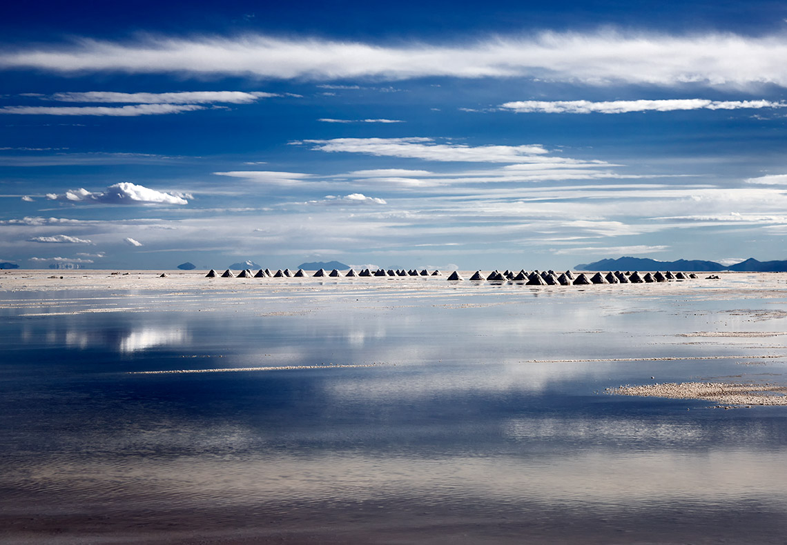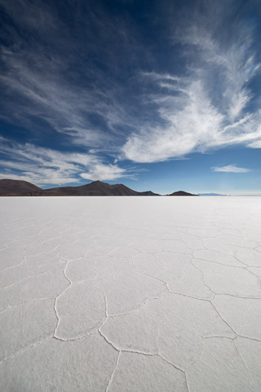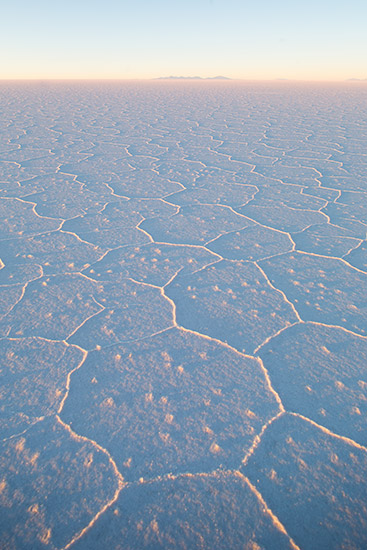 At over four thousand square miles, Salar de Uyuni is the world’s largest salt flat. The Salar is covered by a few meters of salt crust which has an extraordinary flatness, the average altitude varying by no more than a metre over the entire area: the expanse, clear skies and exceptional flatness make the Salar an ideal place for calibrating the altimeters of Earth observation satellites. The early morning and evening sun embosses the drying salt formations against the purple and pale blue skies, but for most of the day the brilliant light and whiteness of the salt eliminate any sense of shape, distance or texture, and the sun can cause blindness if proper protection is not worn.