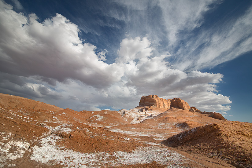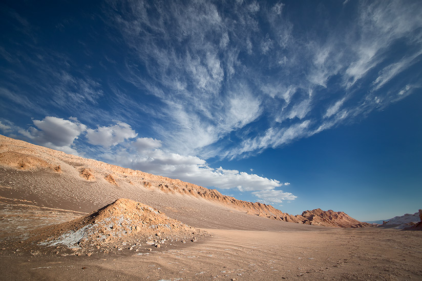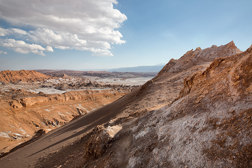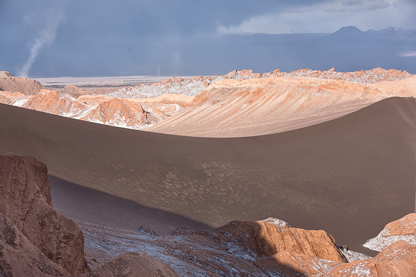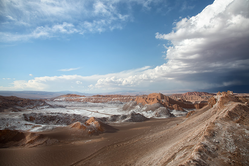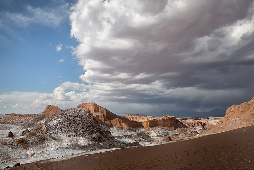 El Valle de la Luna located west of San Pedro de Atacama in Chile is characterised by stone and sand formations carved over time by wind and water. One of the driest places on earth, the landscape is covered with white salt, creating an almost alien landscape similar to those seen from the lunar rover. The seemingly endless surface of the earth here is captivating: hard rock edges are set against smooth dunes, and the brilliant white salt dramatises the dark grey clouds and pale blue of the sky. Carved, almost geometric structures have formed across the landscape and over every brow another magnificent vista opens out across the desert.