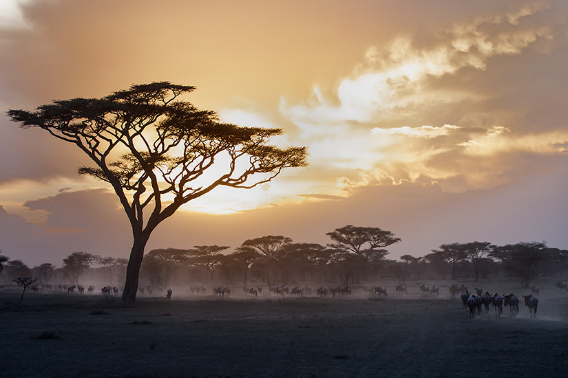 Each year around the same time, the circular great wildebeest migration begins in the Ngorongoro Conservation Area of the southern Serengeti in Tanzania. This migration is a natural phenomenon determined by the availability of grazing. This phase lasts from approximately January to March, when the calving season begins – a time when there is plenty of rain-ripened grass available for the 260,000 zebra that precede 1.7 million wildebeest and the following hundreds of thousands of other plains game, including around 470,000 gazelles.